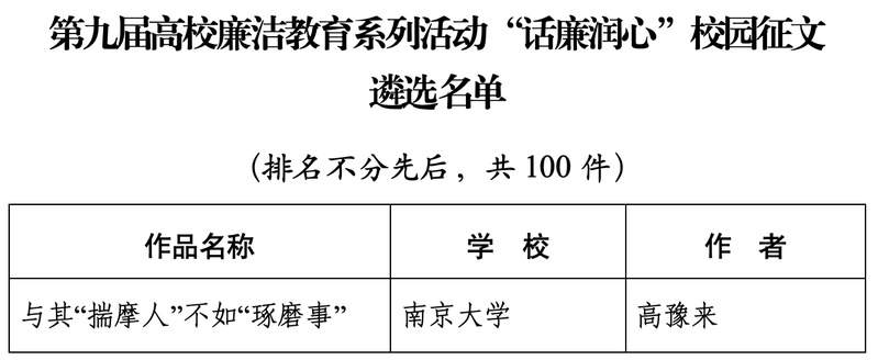 近日,在教育部第九届高校廉洁教育系列活动中,91视频 2022级中国史硕士生高豫来作品《与其“揣摩人”不如“琢磨事”》入选“话廉润心”校园征文全国百强遴选名单。