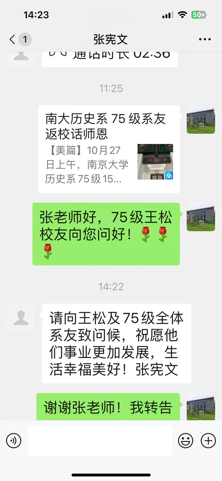 座谈会临近结束时,丁同言校友代表全体校友总结了三层心意:一是“惊喜”,没想到当年规模不大的历史系,如今发展得如此迅速,学科实力与办学规模都实现了跨越式提升;二是“感恩”,此次特意将毕业50周年聚会的地点选在南大,核心目的就是重返母校、感恩恩师,向培育自己的母校与老师致以最诚挚的敬意;三是“期待”,如今母校已形成“一校四区”的办学格局,发展目标明确为“中国特色、世界一流”,“我们期盼着母校实现这一宏伟目标的那一天,届时再回母校相聚,共同见证这一荣耀时刻!”