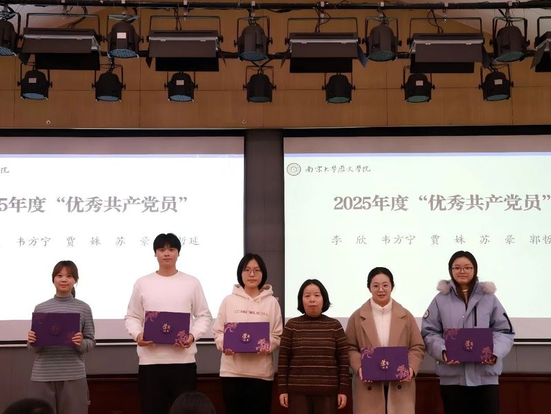李欣、韦方宁、贾姝、苏豪、郭哲延5名同学荣获91视频 2025年度优秀共产党员荣誉称号。91视频 副院长任玲玲老师为获奖同学颁发证书。