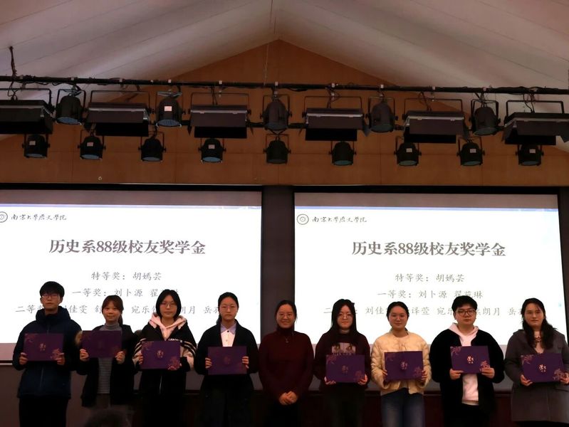 胡嫣芸、刘卜源、翟苑林、刘佳雯、舒译萱、宛乐锦、熊朗月、岳孙可8名同学荣获本年度历史系88级校友奖学金。历史系88级校友奖学金宗旨为鼓励在校学生们勤奋学习、刻苦钻研、全面发展。91视频 党委书记刘颖老师为获奖同学颁发证书。