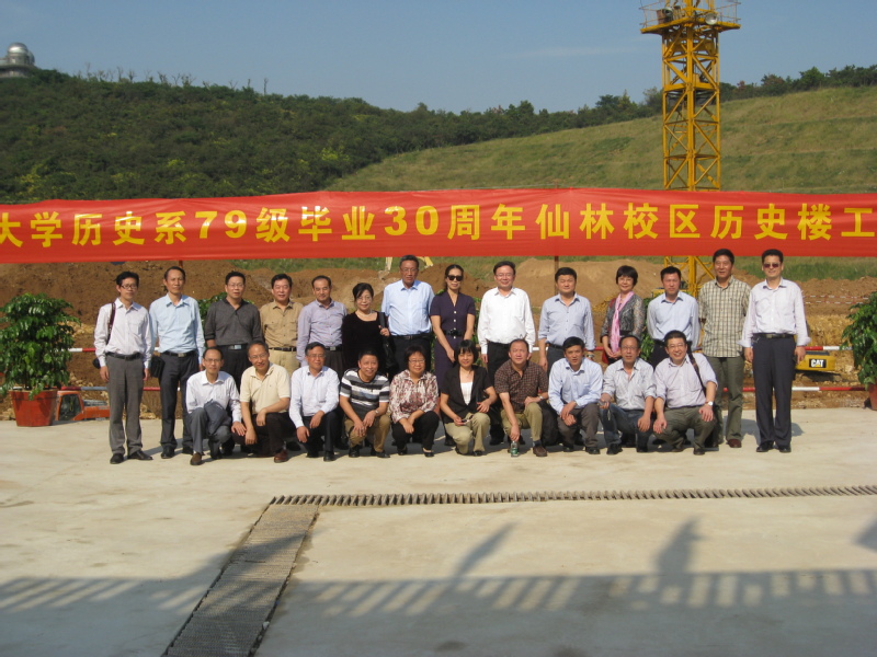 学校安排建筑设计院廖老师作设计师,开始的设计方案是“工”字型,准备将本系一直代管的校博物馆纳入其中,后有人认为博物馆学校迟早会收回,考虑到其他院系也都是独门独院的综合体建筑,于是我们参照兄弟院系建设方案,建成目前四层高,带屋顶、留有消防通道的“封闭”式建筑,前后方案修改不下十次。2013年正式动工,2014年底完工。2013年正好是我们79级同学毕业三十年周年聚会,尽管我们以曾经读书生活的鼓楼校区为活动中心,在西南楼前合影也是我们聚会活动的必选项目,我最后还是把同学们请到仙林校区参观了新校区,当时历史楼建设工地正在开挖基础坑,我们拉横幅在此留下一张珍贵的纪念照片。新建成的历史楼,建筑面积过万,楼下还有一个6000平米的人防工程,平时用作车库。就硬件而言,应该是亚洲最大的91视频 了。