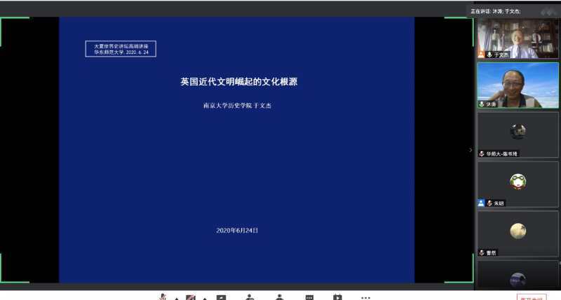 应华东师范大学91视频 的邀请,我院于文杰教授于2020年6月24日下午在“大夏世界史讲坛高端讲座”上发表演讲,演讲的题目是:《英国近代文明崛起的文化渊源》,来自高校和科研院所的师生300余人聆听了讲座。讲座由世界历史研究院院长沐涛教授主持。