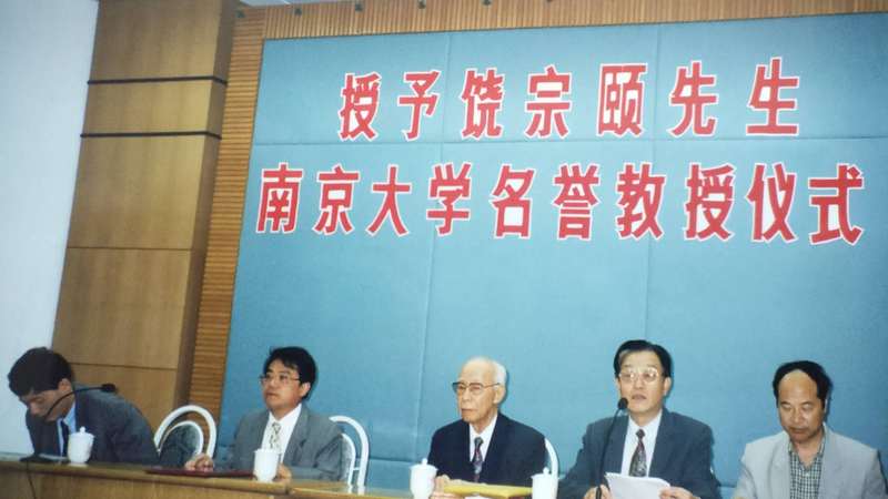 90年代以來,內地有許多高校和學術機構都曾向饒公頒授過名譽職務,南京大學是我的母校,我自然也想從中牽線,聘請饒公出任南大的名譽教授。在徵求饒公的同意後,我即將此意向我的老師茅家琦和蔣贊初等幾位教授提出,他們非常贊同,並立即與校領導溝通,很快就得到蔣樹聲校長和其他校領導的積極響應。1999年春天,南京大學為表彰饒宗頤教授在國學研究中的卓越貢獻,特來函聘請他擔任南京大學的名譽教授,並決定於校慶前夕的5 月18日在南大舉行隆重的頒授儀式。