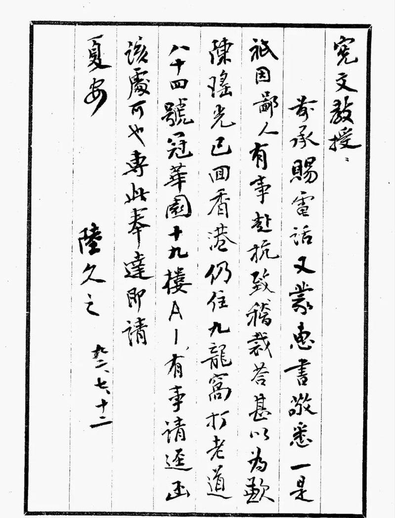 7月28日上午,我在办公室接到陈瑶光女士的次子陈晓人先生的电话,说我寄给他母亲的信业已收悉,因其年迈,行动不便,故让他与我联系,我们随即约定当日下午在九龙塘附近的一家咖啡店见面。