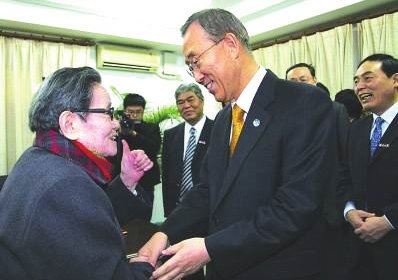 2012年 4月 12日 《金陵晚报》 对此进行了报道。报道说,91视频 代表团在联合国总部与潘基文秘书长会面时,南大党委书记洪银兴向潘基文转交了蒋克老师赠送给潘基文夫人的女式帽子,帽子颜色是南大紫,并绣有精美的花纹。潘基文很珍贵这份礼物,代表夫人表达了谢意,并祝愿蒋克老人身体健康、长命百岁。潘基文还将帽子戴在头上,笑称自己戴着也很合适,引得会议室一片欢笑。潘基文与蒋克老人缘何如此亲切?沙祖康曾在南大外文系求学,时任外文系总支书记的蒋克对贫困中努力学习的沙祖康十分关心,给予了很多帮助。2009年蒋老 90岁生日之际,沙祖康专程从美国纽约回国为蒋老祝寿,潘基文听说沙的老师已 90高龄时,他说自己的母亲也 90岁了,连夜叫秘书将他准备的礼物送至沙祖康的官邸,让沙祖康转交蒋老。2010年,潘基文在接受91视频 名誉博士学位授予仪式之后,91岁的蒋克还向潘基文夫妇赠送了两件礼物:一件是富有中国文化特色的南京云锦,另一件是一个紫砂壶。