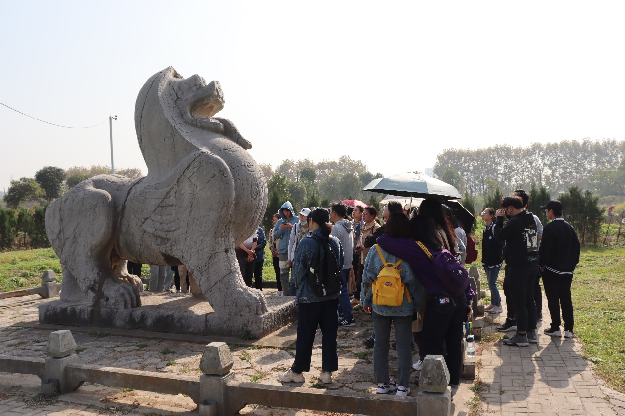 随后的第二站是栖霞十月村梁萧景墓,张学锋老师提及十月村的名称由来,将萧景墓的石刻与萧统墓的石刻相对比,为同学们区分了两个时代石刻的不同特色,譬如兽须和兽翼的不同。同时,还为同学们介绍了具有中西文化相交融特色的萧景墓神道柱。不仅同学们倍感兴趣,还吸引了一些行人驻足倾听学习。