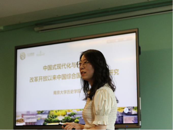 张萌副教授围绕《改革开放以来中国综合国力复兴研究》课题展开介绍,分析了综合国力、中国式现代化与民族复兴三者之间的关系,并运用综合国力评估模型对四个阶段的综合国力发展做出横向和纵向评估,描绘了改革开放以来中国国力变迁的过程。