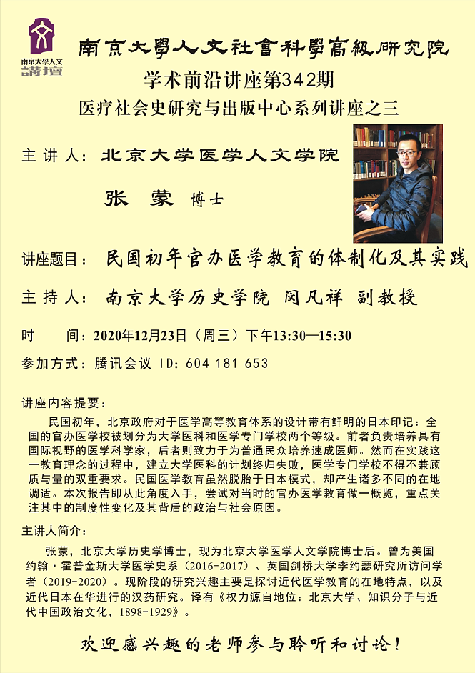 讲座预告 | 民国初年官办医学教育的体制化及其实践