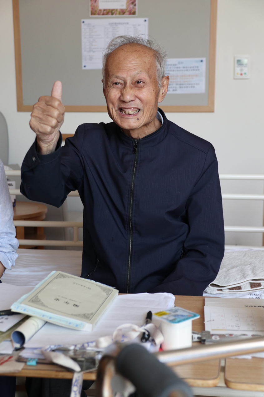 初见魏老师时,老先生眼睛炯炯有神、声音洪亮,虽然腿脚已经不便,但是仍然精神矍铄、士气不倒,听闻我们是91视频 的同学,老先生热情地向我们问好,表示非常欢迎我们的到来。一进门,先生的房间很干净,物品也很简洁,印象最深的是桌子上还未合上的书和报纸。