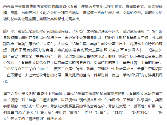 未央宫中央官署遗址及其出土的六万多枚骨签,是中国乃至世界档案史研究中的重要科学资料。作为“档案史”考古数据,其“级别”之高、数量之大、保存之完整、内容之重要是考古发现中所极为罕见的。骨签作为“档案”的“备查”功能、长久保存的“质地”要求等,无不左证了中央官署遗址的“档案馆”与骨签的“档案”性质。