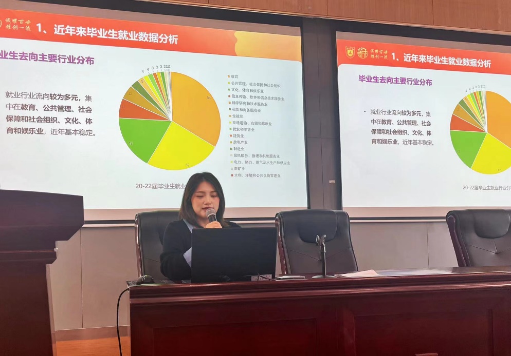 会议伊始,研究生辅导员王恩惠结合相关数据,简要地介绍了近三年来91视频 硕士毕业生规模、就业情况以及毕业生的去向,按照专业为大家梳理了近三年来毕业生的就业结构与就业选择。还分析了当前毕业生整体就业的形势,王恩惠建议不要过于局限于自己所看的就业圈子里,打开求职新思路,勇于去接触新的东西,多去参加学校举办的宣讲会。