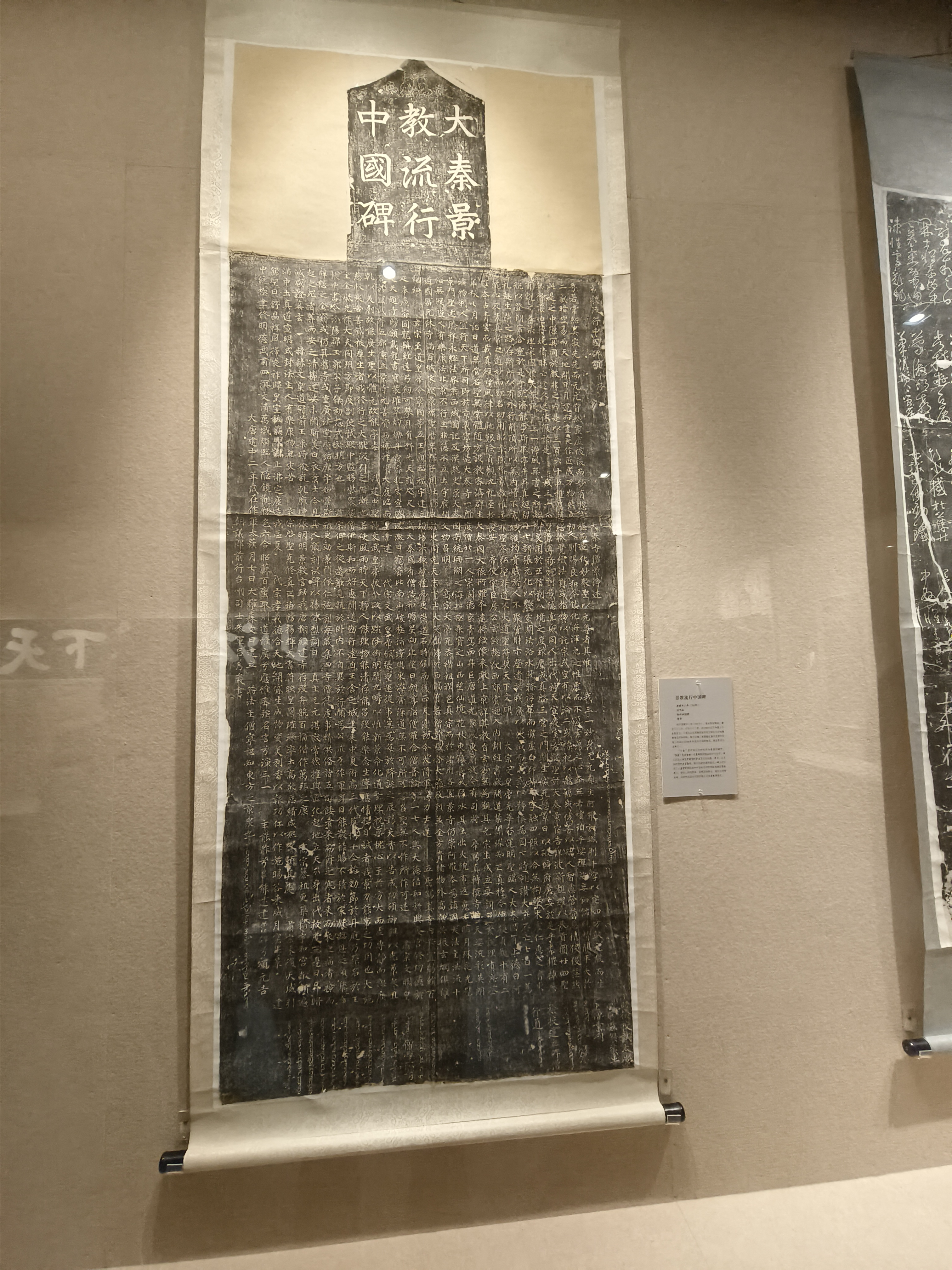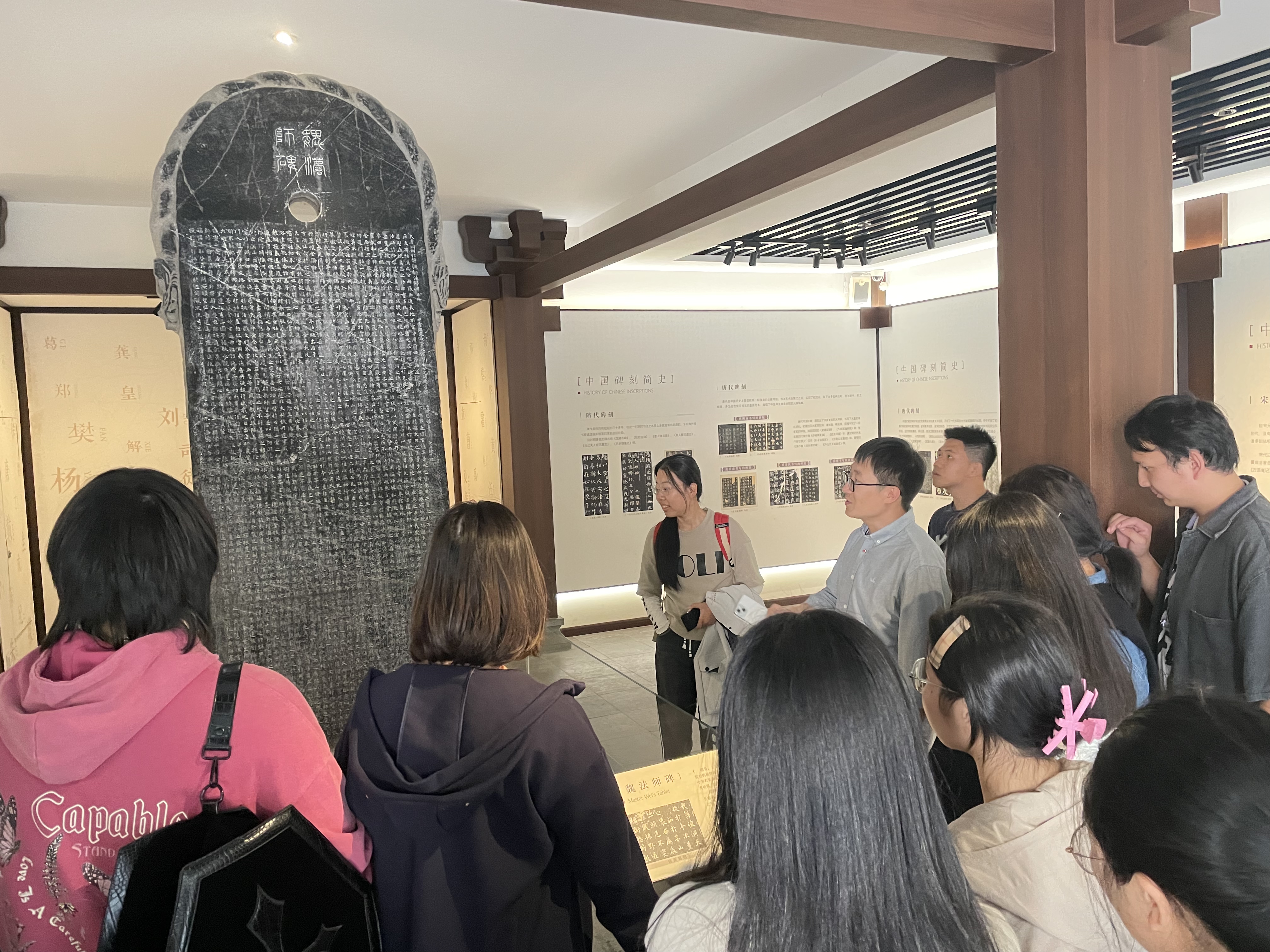 来到“汉字之美”馆藏历代碑帖特展的展厅,于老师特别为同学们介绍了“唐大秦景教流行中国碑”。碑文记述了当时景教在中国的传播情况,也反映了长安城中第一所景教寺院的位置与发展情状。此外,碑下部有古叙利亚文,对研究东罗马传教所用的文字意义匪浅。