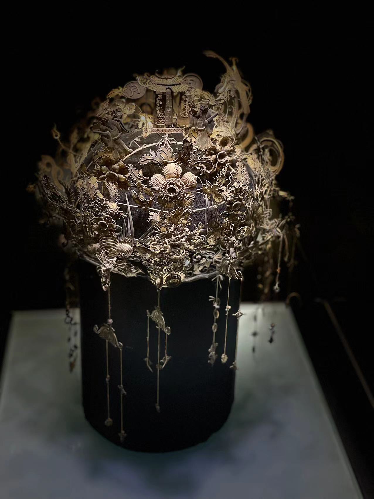 此后师生接着参观了陶瓷器展馆与金银器展馆。陶瓷器展馆的“青釉原始瓷鸟饰带盖罐”展示了吴地器物的风貌;金银器展馆的“银镀金凤冠”更令人叹服:明清两代,金银饰物种类齐全、工艺更趋实用,此冠就是典型代表。
