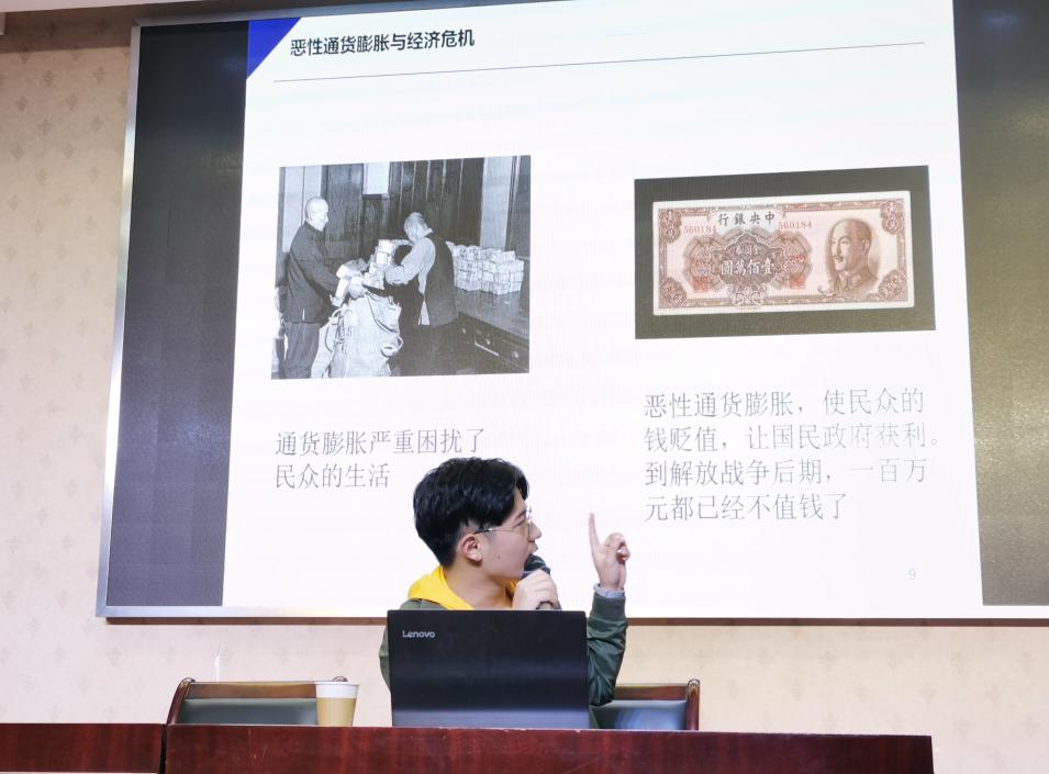 后两部分以“新生”为关键词,由李泽晖同学讲述。他以记录“占领总统府”的视频为引子,首先介绍了共产党接管南京前的三项准备,指明了南京的解放得以实现的原因。随后,他以“肃特斗争”、保甲组织等运动、制度为例,讲解了共产党接管南京以后,在稳定社会秩序方面所做的努力。最后,李泽晖在梳理了共青团和少先队建立过程的基础上,引用了91视频 口述历史协会对西南服务团的采访所得,指出了青年学生的革命实践对处理解放后的复杂问题所具有的重要作用。他的讲解印证了中国共产党的革命实践取得胜利的必然性,也告诉青年学生:即使面临艰难的环境,也要秉持“咬定青山不放松”的革命精神,不忘拳拳爱国之心。