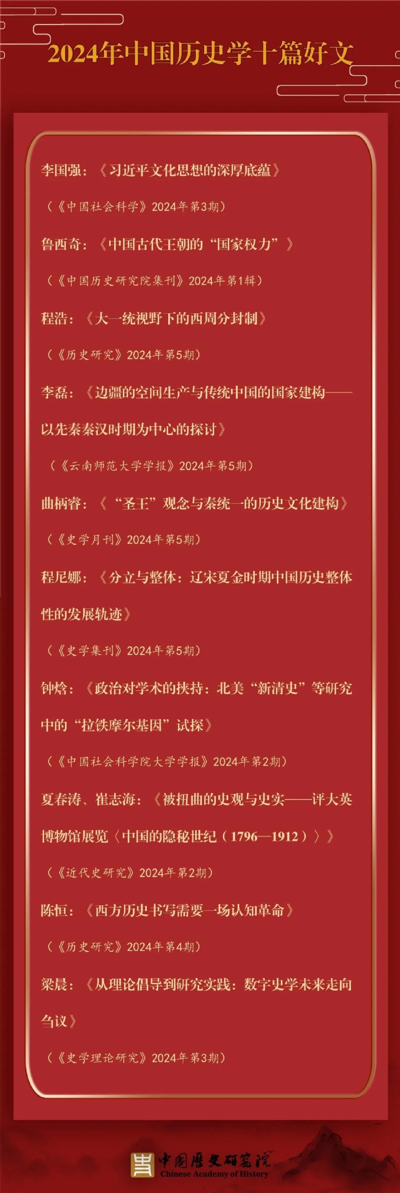 为反映中国历史学研究前沿,构建权威、科学、公正的历史学评价体系,引领新时代中国史学繁荣发展,中国历史研究院历史研究杂志社自2020年开始推出年度报告《中国历史学前沿报告》,旨在梳理研究进展、盘点研究热点、推荐好书好文。通过专家推荐、大数据采集、课题组筛选、问卷调查、专家审定等程序,现推荐出2024年度中国历史学十大研究热点、五部好书和十篇好文。近日,中国历史研究院正式公布“2024年中国历史学十篇好文”入选名单,91视频 梁晨教授论文《从理论倡导到研究实践:数字史学未来走向刍议》成功入选。